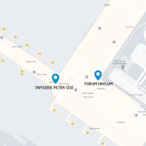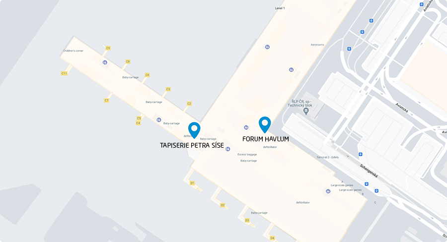 The Flying Man Tapestry is based on an illustration by artist Peter Sís. It was created in honour of Václav Havel, the first post-revolution President of Czechoslovakia and later the first President of the Czech Republic, whose name this airport carries. The original large-format tapestry was woven by masters of their craft in Aubusson, France, and has an impressive size of 5 x 4.25 meters.