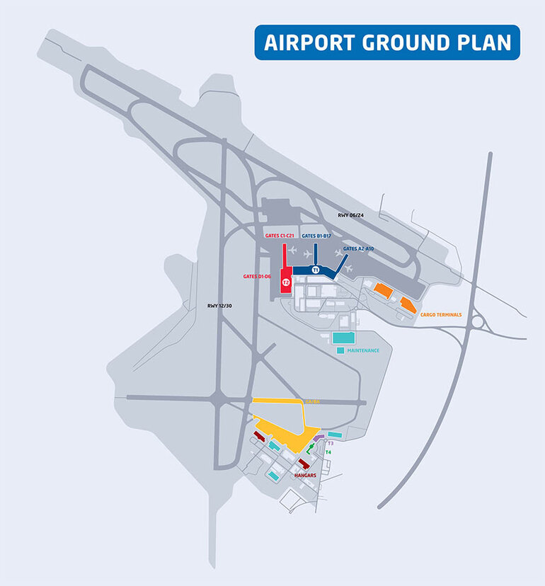 Cargo flights are dispatched from three terminals in northeastern part of the airport. More details about available equipment, services and storage area of terminals can be found here . Aircraft stand dimensions can be found here.