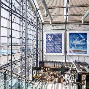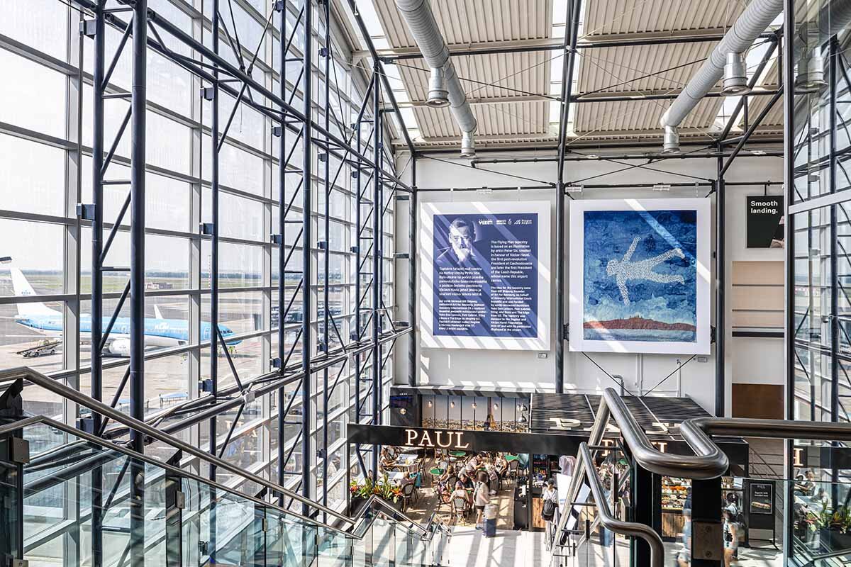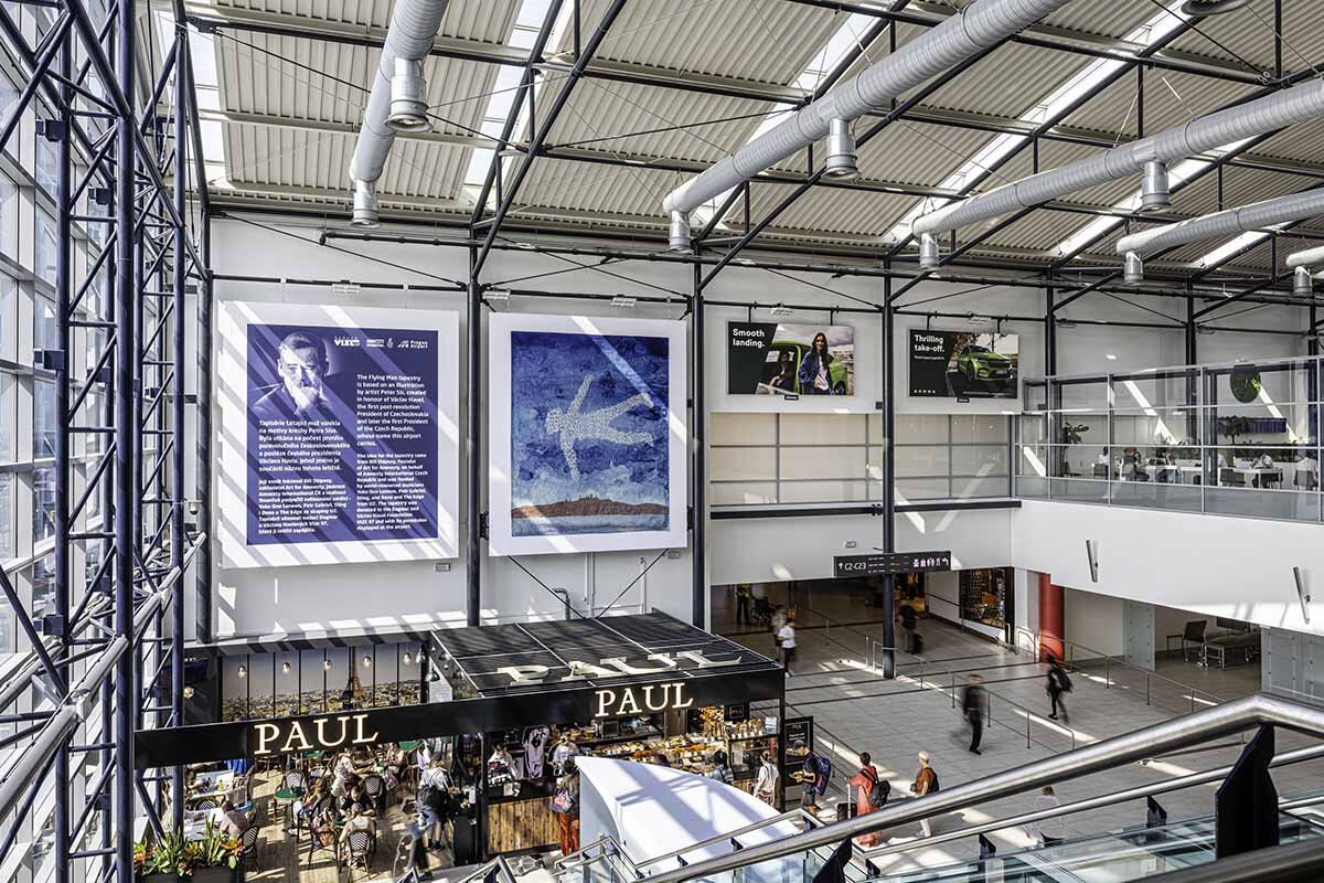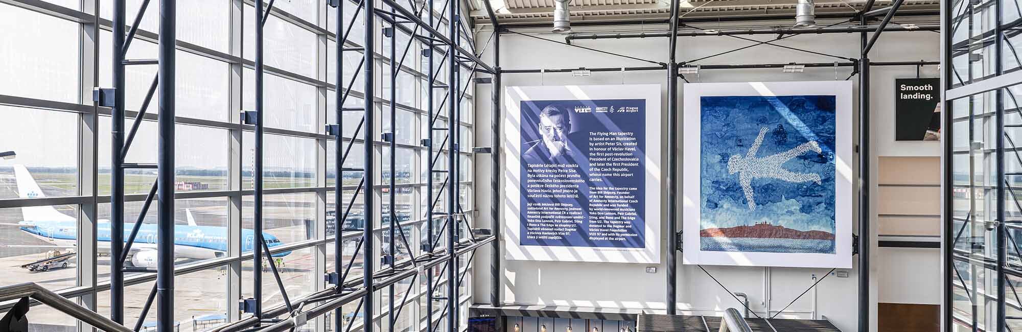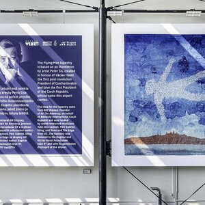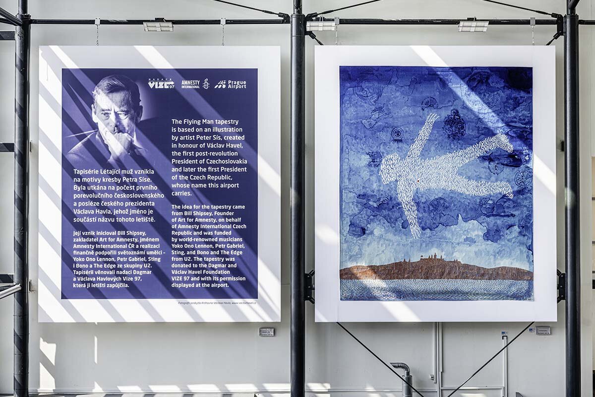 Flying ManThe tapestry, woven by French master weavers, was created in honor of President Václav Havel as part of the Art for Amnesty program by Amnesty International. Back to All services Terminal 2, Pier C Past the checkpoint Flying Man Now open Learn More about Artist Monday Nonstop Tuesday Nonstop Wednesday Nonstop Thursday Nonstop Friday Nonstop Saturday Nonstop Sunday Nonstop A Flying Figure with a Bright Red HeartIn Terminal 2, just beyond the security checkpoint, visitors can admire a monumental tapestry by world-renowned artist Peter Sís. Measuring 5 × 4.25 meters, this textile installation depicts a flock of white birds forming the silhouette of a flying figure with a bright red heart—an homage to a signature element often associated with Václav Havel.The tapestry is based on Sís’s 2011 illustration The Last Audience, created as a tribute to the late president. Thanks to an initiative by Bill Shipsey of Art for Amnesty, the illustration was transformed into textile form by master weavers in Aubusson, France. The project was funded by global artists including Bono and The Edge of U2, Peter Gabriel, Sting, and Yoko Ono.Unveiled on December 9, 2012, the tapestry serves as a lasting reminder to travelers of Václav Havel’s legacy as a symbol of freedom, human rights, and civic courage. You could be interested in Prague Airport LIVE Enjoy a unique experience. Track air traffic in au ...More locations Opening hours vary More information Smilebox Photo Booth Create printed photos with original backgrounds to ...Past the checkpoint Now open More information Anamorphic Portrait of Václav Havel An installation composed of over 3,000 authentic p ...Public Area Now open More information Czech Masters, World-class Crystal A unique exhibition of glass and wooden sculptures ...More locations Now open More information