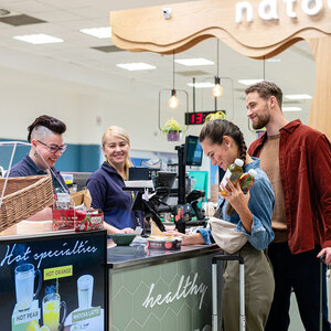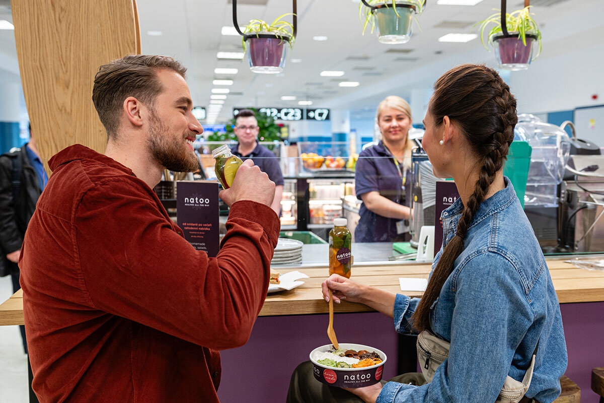NatooHealthy all the way - a place to eat healthy and varied food while waiting for your flight. Back to All services Terminal 1, Pier B Past the checkpoint Natoo Now open +420 734 301 773 Contact us Learn More Monday 7:00 AM - 9:00 PM Tuesday 7:00 AM - 9:00 PM Wednesday 7:00 AM - 9:00 PM Thursday 7:00 AM - 9:00 PM Friday 7:00 AM - 9:00 PM Saturday 7:00 AM - 9:00 PM Sunday 7:00 AM - 9:00 PM Terminal 2, Pier C Past the checkpoint Natoo Now open +420 734 301 773 Contact us Learn More Monday 7:00 AM - 9:00 PM Tuesday 7:00 AM - 9:00 PM Wednesday 7:00 AM - 9:00 PM Thursday 7:00 AM - 9:00 PM Friday 7:00 AM - 9:00 PM Saturday 7:00 AM - 9:00 PM Sunday 7:00 AM - 9:00 PM Natoo focuses on new trends in healthy nutrition, deliciously prepared and elegantly served. The ecological concept combines local ingredients with sustainable development and is intended for everyone for whom eating and drinking means being responsible for their bodies and our planet. You could be interested in Costa Coffee Expert baristas, seasonal coffee news, wide range ...More locations Now open More information PAUL Traditional French bakery, excellent baguettes, an ...Past the checkpoint Now open More information Starbucks A café for all coffee lovers who come back for fri ...Public Area Now open More information Beverage and snack vending machines Vending machines at the airport offer quick and co ...More locations Now open More information