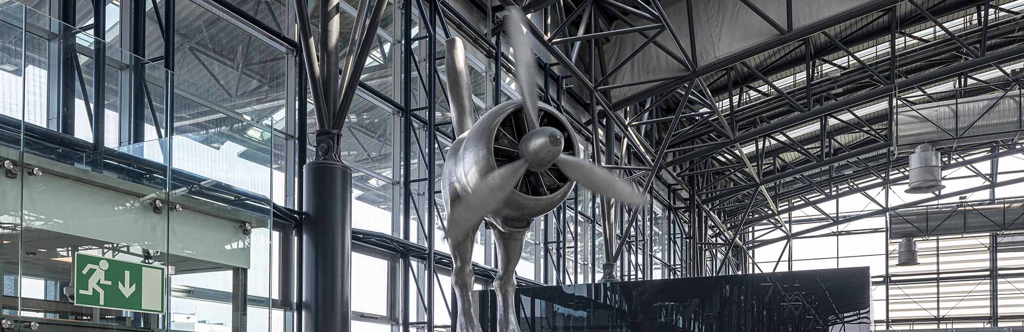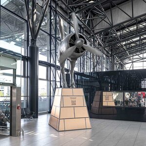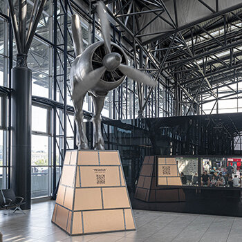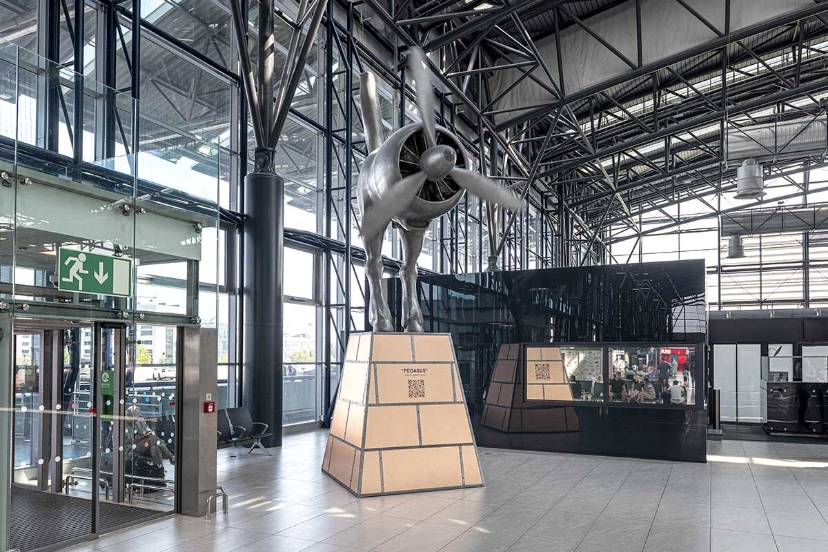 PegasusPegasus is half horse, half engine. The front part of the body and the horse’s head are replaced by a fully mechanical jet engine. Back to All services Terminal 2 Public Area Pegasus Now open Learn More about Artist Monday Nonstop Tuesday Nonstop Wednesday Nonstop Thursday Nonstop Friday Nonstop Saturday Nonstop Sunday Nonstop Half Horse, Half EngineLocated in Terminal 2 near the departures area, Pegasus is a unique sculpture by renowned Czech artist David Černý. This kinetic installation combines the form of a horse with that of a jet engine, symbolizing the fusion of motion and technology.David Černý is well known for his provocative and original works that often merge art with mechanics, and Pegasus is no exception. The installation brings a striking element of contemporary art and innovation to the airport environment. With its unconventional appearance, the sculpture is sure to catch the eye of every traveler passing by. You could be interested in Anamorphic Portrait of Václav Havel An installation composed of over 3,000 authentic p ...Public Area Now open More information Viewing Terrace Experience airport operations up close from the Ai ...Public Area Now open More information Prague Airport LIVE Enjoy a unique experience. Track air traffic in au ...More locations Opening hours vary More information Piano Make your airport wait more enjoyable by playing t ...More locations Now open More information