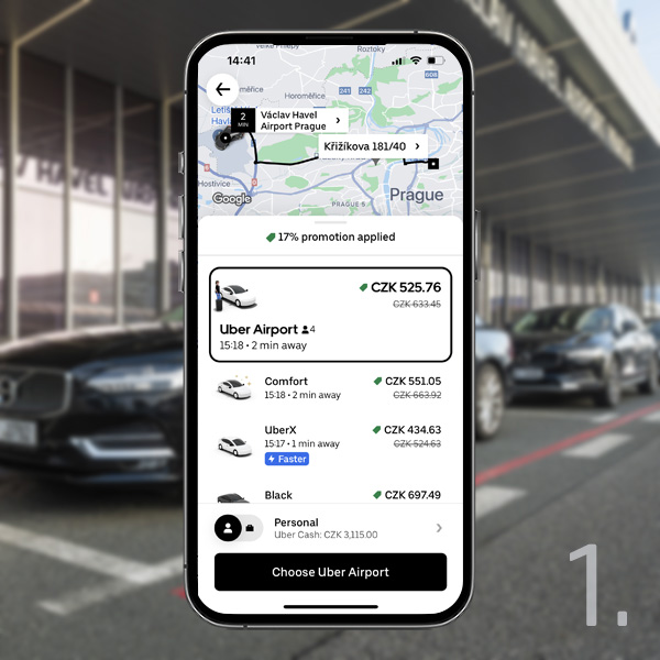 Official Taxi Service at Vaclav Havel Airport PragueUse the services of Uber for your trips to/from the airport. Uber Airport offers high end cars and experienced Airport drivers. Taxi Service Ordering Options You can book your ride using the Uber app, self-service kiosks, or service counters. To download the app, click here. Contact Information SharingRozbalitNo registration in the sense of entering personal data is required to order the service. Only your email address is required. Self-service kiosks or counters only require emails to comply with legislation, not as a basis for registration or other marketing activities.For easier communication, please enter your phone number as well to receive all the necessary information related to your ride. The phone number is only requested from passengers to ensure the smoothest check-in possible, as previous experience shows that email communication often fails, either due to a wrong email address or due to the lack of local passenger data.What are the advantages? If you provide your email address, your tax receipt will be sent to you electronically along with a summary of your trip. This way you can have all the information at hand. Electronic versions also help us to protect the environment. Passengers value mobile phone communication for its seamless functionality and smooth operation. 1. Uber applicationThe fastest way of booking is via the Uber application, which shows you where you are going and how much you will pay for the ride. You will have everything handy on your phone. Payments are accepted in cash or by a card which you connect with the application. Select the Uber Airport product from the menu and you’re good to go. 2. Self-Service KiosksYou can also use self-service kiosks, with a similar user interface as in the application. With this option, payments are only possible by card through the terminal. After payment is completed, you will get a receipt with all the necessary information for your ride. Printed instructions for booking a ride can also be found on the kiosk right next to the monitor. 3. Service Counter with AssistantsIf you need help with your order, we have a counter with staff at each terminal. At the counter, they will tell you all the necessary information and help you order a taxi. There you can pay by card or cash.Opening hours of the counter are daily 7:00 a.m. - 12:00 a.m.After ordering a taxi ride, you will receive a six-digit PIN code to share with the driver after boarding the vehicle. Please note that the service cannot be used other than with a pre-ordered ride and the generated PIN code.Areas designed for passenger boarding (Pick-up Points) are located directly in front of the arrival halls of Terminals 1 and 2. In case of any uncertainties, look for an Uber coordinator or visit the Uber counter in one of the arrival halls.The Pick-up Point is identical for all three methods of ordering the service.Cars are available non-stop directly in front of the arrival halls of both terminals. For better on-site orientation and your comfort, dispatchers are ready to help by the arrival hall exits or at the car meeting points (7:00 a.m. - 9:00 p.m.).Have a nice ride.Open/Download the app Open / Download the app uber.com interface. Uber Contact help.uber.com