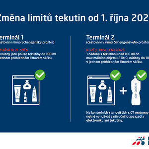 30. 9. 2025Cestování z Letiště Václava Havla Praha bude opět o něco pohodlnější. Díky moderním CT rentgenům, které byly letos v květnu nasazeny v Terminálu 2 a na konci srpna úspěšně recertifikovány, dojde od 1. října 2025 k výraznému uvolnění pravidel pro přepravu tekutin na palubě letadel. Cestující z Terminálu 2 si budou nově moci vzít jednu nádobu s tekutinou nad 100 ml až do objemu 2 litrů na osobu, navíc k jednomu standardnímu litrovému sáčku s nádobami do 100 ml.„V rámci aktuálních průzkumů se na vyšší spokojenosti cestujících při průchodu bezpečnostní kontrolou projevil v letních měsících už jen fakt, že nemusí od zavedení CT rentgenů v Terminálu 2 vyndávat z příručního zavazadla elektroniku ani tekutiny zvlášť. Nově také umožňujeme přepravu většího množství tekutin, což je významný krok vpřed,“ uvádí Martin Kučera, člen představenstva Letiště Praha zodpovědný za provoz a bezpečnost.Jaká jsou nová pravidla?Od 1. října 2025 se pravidla liší podle terminálu, ze kterého cestující odlétají:Terminál 1 (cestování mimo Schengenský prostor):Zůstává beze změn. Povoleny jsou pouze tekutiny do 100 ml v jednom průhledném litrovém sáčku. Tekutiny nad 100 ml nejsou povoleny.Terminál 2 (cestování v rámci Schengenského prostoru):Nově je povolena navíc 1 nádoba s tekutinou nad 100 ml do maximálního objemu 2 litrů na osobu (např. kosmetika, potraviny či nealkoholické a alkoholické nápoje) + nádoby do 100 ml v jednom průhledném litrovém sáčku.Na kontrolních stanovištích s CT rentgeny navíc není nutné vyndávat z příručního zavazadla elektroniku ani tekutiny.Letiště Praha pořídilo v letošním roce 6 CT rentgenů v Terminálu 2 a v příštím roce plánuje pořízení dalších 2 těchto zařízení. Na ostatních stanovištích v Terminálu 2 s klasickými rentgeny je přeprava většího množství tekutin také povolena, ale cestující musí elektroniku a tekutiny nadále vyndávat z příručního zavazadla. Na tuto skutečnost jsou cestující vždy upozorněni prostřednictvím informační tabule nebo personálem bezpečnostní kontroly.Proč jsou v jednotlivých terminálech odlišná pravidla?Změna limitů tekutin je možná díky instalaci moderních CT rentgenů, které zvyšují jak bezpečnost, tak plynulost kontroly. Terminál 1 zatím touto technologií nedisponuje. V rámci plánované modernizace Letiště Václava Havla Praha se počítá s výstavbou centrální bezpečnostní kontroly také v tomto terminálu, a to obdobně, jak ji znají cestující z Terminálu 2. Letiště Praha rovněž připravuje modernizaci samotného Terminálu 2, kde v současnosti délka kontrolní tratě neumožňuje zavedení ještě většího objemu tekutin bez rizika zahlcení systému.„Naším cílem je dlouhodobě analyzovat provoz a v případě pozitivních výsledků postupně povolovat další objem tekutin. Věříme ale, že i tato dílčí změna je pro cestující významným benefitem. Modernizace letiště je pro nás o to více potřeba, a to zejména pro vyšší komfort cestujících, které budou čekat moderní prostory s nejnovější technologií,“ doplňuje Martin Kučera.Upozornění pro cestujícíLetiště Praha upozorňuje, že pravidla přepravy tekutin se mohou lišit na různých letištích, a to v závislosti na dostupnosti moderní rentgenové technologie a prostorových možnostech. Doporučuje si proto vždy před cestou ověřit pravidla také pro letiště návratu.Bez ohledu na výše uvedená omezení i nadále platí výjimky pro:dětskou stravu,speciální výživu,tekutiny z důvodu zdravotního stavu.Pro odbavená zavazadla platí stále stejná pravidla. Letiště Praha připomíná několik základních z nich:Powerbanky, notebooky či elektronické cigarety patří vždy do příručního zavazadla.Drobnou elektroniku (např. zubní kartáčky a holicí strojky) je možné mít i v odbaveném zavazadle, ale musí být zajištěna proti samovolnému zapnutí. V opačném případě hrozí dodatečná kontrola nebo zpoždění letu.Zakázané předměty: Do žádného zavazadla nepatří hořlaviny, těkavé látky, zbraně, výbušniny apod.Pro aktuální informace o bezpečnostních pravidlech a doporučeních navštivte prosím stránky Bezpečnostní kontrola | Letiště Václava Havla Praha, Ruzyně. Kontakt pro média Tisková mluvčí Letiště Praha Denisa Hejtmánková 601131812 denisa.hejtmankova@prg.aero