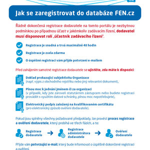 V případě, že ještě nejste registrovaným dodavatelem, doporučujeme Vám pro plné využití všech možností elektronického nástroje Tender arena, zejména pak pro podání nabídky, účasti na elektronické aukci a komunikaci se zadavatelem, abyste se zaregistrovali na portálu FEN.cz. Pro registraci do databáze využijte odkaz zde: FEN.