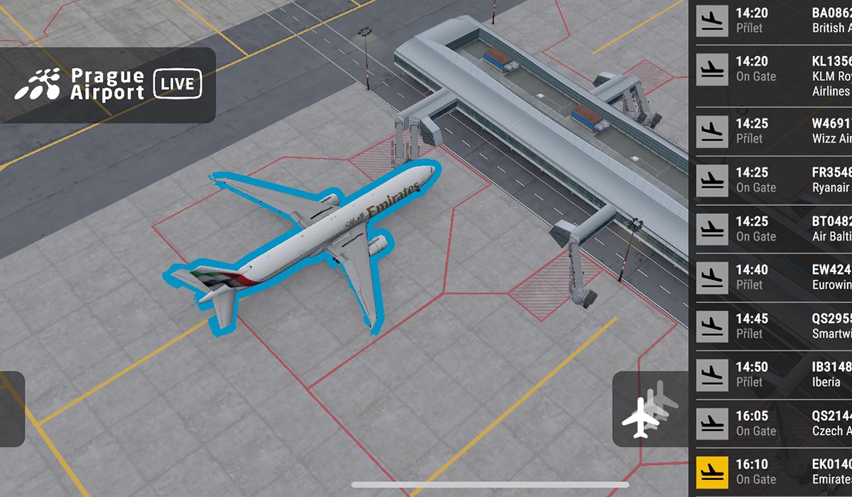 Prague Airport LIVE Užijte si jedinečný zážitek. Sledujte letecký provoz v rozšířené realitě (AR) a v reálném čase. Zpět na všechny služby Terminál 2 Veřejná část Model s tabletem v obchodě Gift&Tours Zavřeno Pondělí 09:00 - 16:00 Úterý 09:00 - 16:00 Středa 09:00 - 16:00 Čtvrtek 09:00 - 16:00 Pátek 09:00 - 16:00 Sobota 09:00 - 16:00 Neděle 09:00 - 16:00 Terminál 2 Veřejná část QR kód na vyhlídkové terase Otevřeno Pondělí Nonstop Úterý Nonstop Středa Nonstop Čtvrtek Nonstop Pátek Nonstop Sobota Nonstop Neděle Nonstop Terminál 2 Za kontrolou QR kód v Relax zóně (poblíž Bageterie Boulevard) Otevřeno Pondělí Nonstop Úterý Nonstop Středa Nonstop Čtvrtek Nonstop Pátek Nonstop Sobota Nonstop Neděle Nonstop Terminál 2, Prst C Za kontrolou QR kód umístěný v chodbě prstu C na úrovni gatu C7 Otevřeno Pondělí Nonstop Úterý Nonstop Středa Nonstop Čtvrtek Nonstop Pátek Nonstop Sobota Nonstop Neděle Nonstop Terminál 2, Prst C Za kontrolou QR kód umístěný v chodbě prstu C na úrovni gatu C3 Otevřeno Pondělí Nonstop Úterý Nonstop Středa Nonstop Čtvrtek Nonstop Pátek Nonstop Sobota Nonstop Neděle Nonstop Terminál 2, Prst D Za kontrolou QR kód umístěný v chodbě prstu D na úrovni gatu D4 Otevřeno Pondělí Nonstop Úterý Nonstop Středa Nonstop Čtvrtek Nonstop Pátek Nonstop Sobota Nonstop Neděle Nonstop Terminál 1 Za kontrolou QR kód umístěný v prostoru pro výdej zavazadel Otevřeno Pondělí Nonstop Úterý Nonstop Středa Nonstop Čtvrtek Nonstop Pátek Nonstop Sobota Nonstop Neděle Nonstop Terminál 1, Prst B Za kontrolou QR kód umístěný v chodbě prstu B na úrovni gatu B4 Otevřeno Pondělí Nonstop Úterý Nonstop Středa Nonstop Čtvrtek Nonstop Pátek Nonstop Sobota Nonstop Neděle Nonstop Terminál 1, Prst B Za kontrolou QR kód umístěný v prostoru gatů B10-B18 ve spodním patře prstu B Otevřeno Pondělí Nonstop Úterý Nonstop Středa Nonstop Čtvrtek Nonstop Pátek Nonstop Sobota Nonstop Neděle Nonstop Užijte si jedinečný zážitek na Letišti Václava Havla PrahaUnikátní zážitek v rozšířené realitěReálný provoz – pohybující se letadla a odbavení, vzlety a přistáníPropracovaný 3D model Letiště Václava Havla PrahaReálné typy letadel a oficiální livery leteckých společnostíPohled z ptačí perspektivyPoznejte pražské letiště a jeho fungování dosud nepředstavitelným způsobem. Stáhněte si aplikaci PRG Live nebo navštivte obchod Prague Airport Gift&Tours, kde můžete využít tablet umístěný na velkoformátovém modelu letiště. Prohlédnout si můžete různé části letiště a když vaše zařízení přiblížíte k modelu, uvidíte zblízka odbavení letadla nebo start a přistání. Lze také vybrat / klepnout na libovolné letadlo, kdy se následně zobrazí karta s podrobnostmi o letu. Proměňte svou návštěvu letiště ve vzrušující průzkum fascinujícího světa letectví a poznejte novou dimenzi zábavy. Navrženo a vyvinuto herním studiem Flyboys Games exkluzivně pro Letiště Praha. Stáhněte si aplikaci do svého mobilního zařízeníAktuální informace o letech: Podívejte se, která letadla se aktuálně nacházejí na letišti. Ať už někam letíte nebo vás jen zajímá letectví, získáte detailní přehled o aktuálním provozu. Naše aplikace vám ukáže číslo letu, název letecké společnosti, čas příletu nebo odletu a destinaci. Reálné typy letadel a oficiální zbarvení: Zajímají vás detaily? V aplikaci vždy uvidíte totožný typ letadla jako je ten, který se aktuálně nachází na odbavovací ploše. Naučte se poznávat Boeing od Airbusu a lépe tak poznejte stroje, které spojují svět. Užijte si pohled na úchvatné designy a oficiální zbarvení všech leteckých společností, které lze běžně spatřit jen z okna vašeho gatu. Detailní zpracovaní Letiště Václava Havla Praha: Fascinující detaily nenabízí pouze pohled na letadla, ale i na propracované budovy terminálů, hangárů, parkovacích domů nebo třeba moderní hasičskou stanici. Určitě si nenechte ujít simulaci odbavení na letištní ploše a věrné modely letištní techniky. Mohlo by Vás zajímat Smilebox Fotoautomat Vytvořte si památku na věky v podobě tištěných fot ...Za kontrolou Otevřeno Více informací Dětské koutky Velké prolézačky, klouzačky a hračky pro malé pasa ...Za kontrolou Otevřeno Více informací Velkoformátové hry (šachy; člověče nezlob se apod.) Velkoformátové hry zpestří čas na letišti malým i ...Více umístění Otevřeno Více informací Místnost pro cestující s dětmi Vybavená místnost s přebalovacími pulty, prostorem ...Za kontrolou Otevřeno Více informací