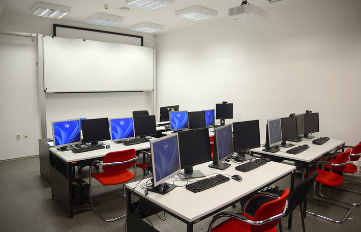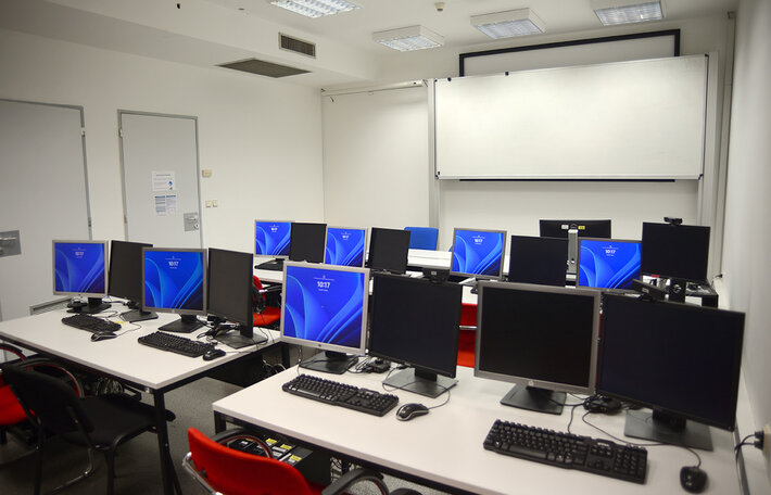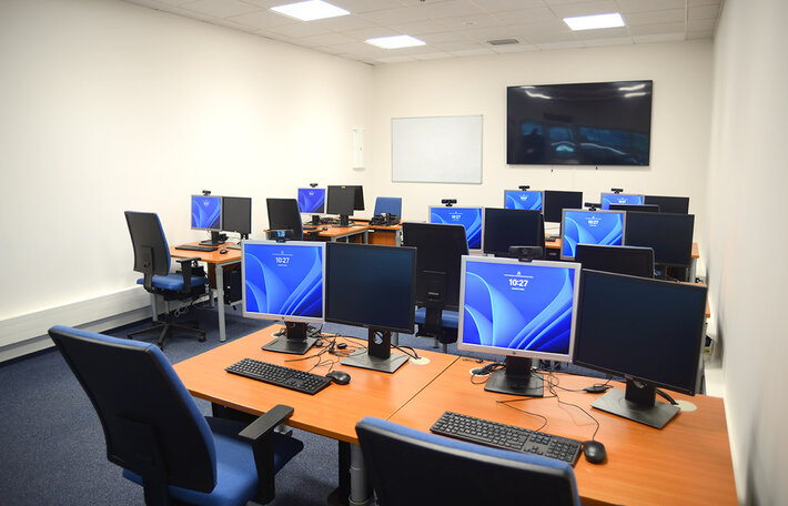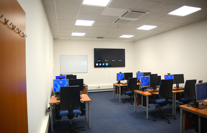 - Vybavení: počítače CUPPS pro školení odbavovacích a rezervačních systémů, standardní počítače s Windows 11, projektor a bílé popisovací tabule. U každého stolu je kamera a sluchátka.