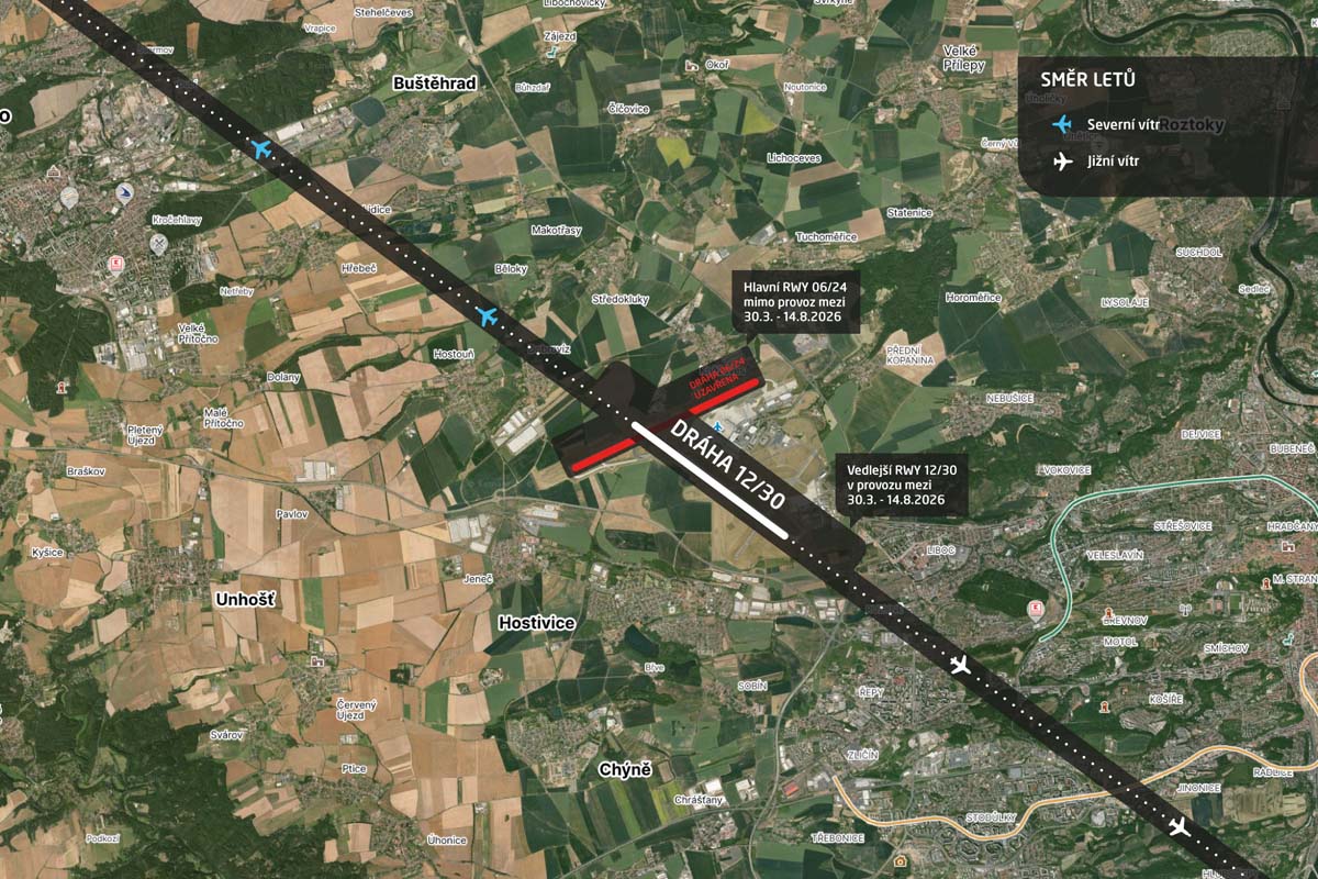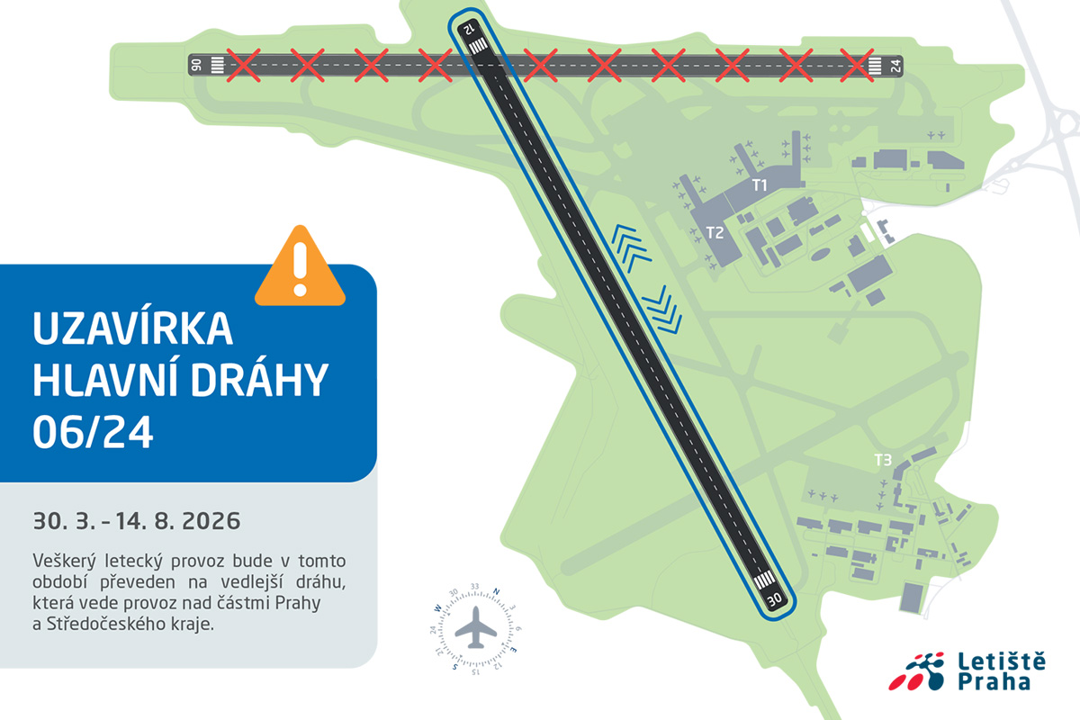 Letištní provoz je převeden na několik měsíců na vedlejší dráhuLetiště Praha zahájilo od 30. března 2025 uzavírku hlavní dráhy 06/24, která potrvá několik měsíců přes větší část letní sezóny. Modernizace dráhy se bude týkat především infrastruktury v okolí dráhy a pojezdových drah. Po dobu oprav bude letecký provoz probíhat výhradně na vedlejší dráze 12/30. Pro podobné případy nemá Letiště Praha bohužel jinou možnost do té doby, než vybuduje paralelní dráhu. Údržba v okolí dráhy zahrnuje celkem 17 stavebních a technologických projektů, které mají za cíl udržet dráhu ve standardech požadovaných předpisy a zvýšit provozní bezpečnost. Mezi největší projekty patří opravy a výstavba pojezdových drah a rekonstrukce části stokového systému pro zkapacitnění odvodu vody z letištních ploch. Tyto práce se odehrávají přímo u hlavní dráhy, což znemožňuje její využívání pro vzlety a přistání. Prezentace o uzavírceČasté dotazy k uzavírce Proč se létá nad Prahou a Kladenskem (provoz na vedlejší dráhu 12/30)?Letiště Praha od 30. března do 14. srpna modernizuje okolí hlavní dráhy a nemůže ji tak využívat pro provoz. Veškerý letecký provoz je proto v této době převeden na vedlejší dráhu 12/30. Jedná se o nezbytné projekty, které jsou nutné pro dlouhodobou udržitelnost a připravenost na budoucí provozní nároky s cílem udržení vysokého standardu bezpečnosti a spolehlivosti provozu na Letišti Václava Havla Praha. Ve standardním provozu se snažíme využívat vedlejší dráhu zcela minimálně, právě proto, že vede letadla nad hustě osídlenými částmi Prahy a Středočeského kraje. V případě dočasného uzavření hlavní dráhy však letiště nemá jinou možnost, než převést veškerý provoz na vedlejší dráhu. Tuto situaci vyřeší až výstavba paralelní dráhy, po jejímž zprovoznění dojde k uzavření vedlejší dráhy. Proč jsou opravy plánovány na letní měsíce, kdy je největší provoz a máme otevřená okna?Termín oprav musel být stanoven na období s nejnižším výskytem mlh, neboť vedlejší dráha, na níž byl převeden veškerý provoz, není přizpůsobena pro vzlety a přistání za snížené viditelnosti. Termín zahájení stavební uzávěry je vždy stanoven s ohledem na rizika nevhodného počasí na nejdřívější možný. Vzhledem k rozsahu stavebních akcí uzavírka hlavní dráhy i tak zasahuje do hlavní letní sezóny. Samotné stavební práce probíhají přibližně čtyři měsíce, což je vzhledem k jejich rozsahu, a také k zapojení externích partnerů, nadstandardně krátký časový úsek. O jakou modernizaci jde, dráhu jste opravovali nedávno.Opravy se netýkají samotné hlavní dráhy, která prošla kompletní rekonstrukcí v letech 2012 a 2013. Celkem bude během uzavírky provedeno 14 projektů Letiště Praha doplněných o tři akce externích partnerů – Pražská plynárenská provede výměnu vysokotlakého plynovodu, Řízení letového provozu ČR zajistí obměnu technologie radionavigačního zařízení ILS (Instrument Landing System) pro směr dráhy 24 a Ředitelství silnic a dálnic bude provádět práce na zkapacitnění mimoúrovňové křižovatky Aviatická x Lipská. Mezi největší stavební akce Letiště Praha bude patřit rekonstrukce a rozšíření křížení pojezdových drah, výstavba nového kabelovodu, výměna oplocení perimetru letiště či výměna LED návěstidel, která slouží k bezpečné navigaci letadel při vzletu, přistání i pojíždění. Všechny tyto a další projekty jsou nutné pro dlouhodobou udržitelnost a připravenost na budoucí provozní nároky s cílem udržení vysokého standardu bezpečnosti a spolehlivosti provozu na Letišti Václava Havla Praha. Kromě těchto projektů bude během uzavírky realizován také soubor standardních údržbových činností, jako je například údržba zpevněných a nezpevněných ploch, údržba podzemních objektů, odstraňování gumy, obnova vodorovného značení a další činnosti. Proč opravy pokračují i tento rok, proč jste neudělali vše najednou už loni?Opravy bohužel nešlo provést najednou v jednom roce, neboť bychom se již termínově pohybovali v měsících s vyšším výskytem nepříznivých povětrnostních podmínek, zejména mlh, což by ohrozilo provozuschopnost letiště. Všechny práce, které během těchto dvou let v okolí hlavní dráhy provádíme, jsou svým rozsahem uskutečněny v nadstandardně krátkém časovém úseku. Na vedlejší dráhu létáte velmi často, i když nejsou žádné opravy.Vedlejší dráha existuje na pražském letišti ve své zpevněné podobě již od 50. let minulého století. Jedná se o plnohodnotná dráhu, pouze s určitými omezeními při provozu za snížené dohlednosti, kterou je letiště oprávněné používat. Za běžných podmínek se snažíme vedlejší dráhu zejména z hlukových důvodů používat co nejméně. Bohužel pro případy, kdy je hlavní dráha mimo provoz, nemáme jinou možnost.K převedení leteckého provozu může dojít i z jiných důvodů, ale v podstatně kratších časových úsecích.Důvody bývají zejména následující:Boční vítr– platí pro celý úsek konečného přiblížení, tedy nejen u země.Výskyt bouřkové oblačnosti v příletovém/odletovém sektoru hlavní dráhy (RWY 24 či RWY 06).RWY 06/24 je mimo provoz. Proč jste o uzavírce včas neinformovali občany?O plánované situaci jsme informovali s předstihem a využili jsme více komunikačních kanálů:Informovali jsme všechny dotčené lokality a jednali s jejich zastupiteli, kteří zprávu zveřejnili v místních médiích.Vydali jsme tiskovou zprávu, jež byla převzata řadou celostátních médií.informaci jsme zařadili do elektronického zpravodaje.Zveřej